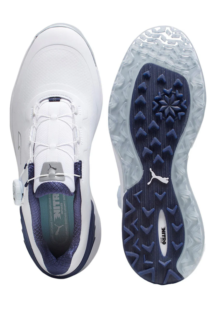 The Puma Alphacat NITRO DISC Golf Shoes (White) use Puma’s supremely responsive cushioning tech, adapted for golfers. So you can tee off in comfort for 18 long holes. The PRO-ADAPT outsole provides multi-traction, and the DISC closure offers a secure lockdown when you swing.