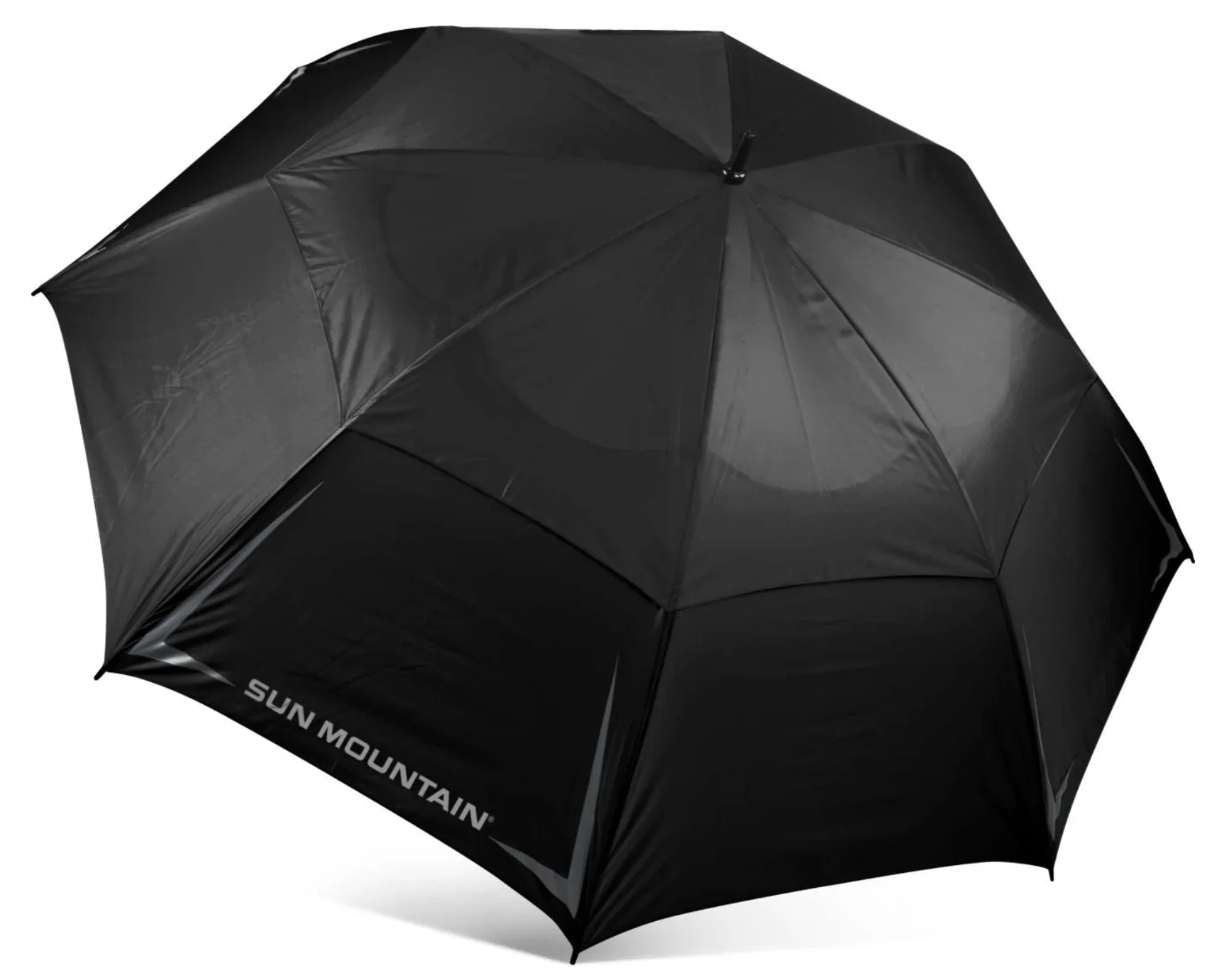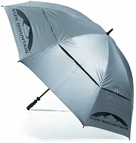 The auto-operation, double-canopy umbrella is perfect for playing golf in the rain or sun. The Black Umbrella Is rated UPF 30+. The rubber-covered, slip-resistant handle fits perfectly in the umbrella holder of Sun Mountain carts.